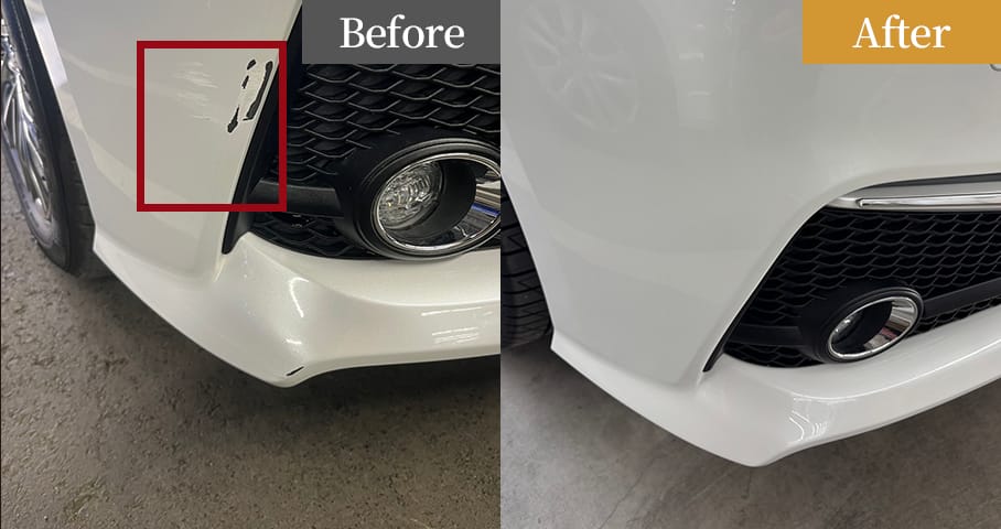 フロントバンパー左側に擦りキズがあり、塗膜の剥がれが目立つ状態でしたが、へこみはなく、簡易鈑金塗装で十分に対応可能と判断しました。